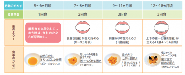 口の発達に合わせて、少しずつ形のあるものを食べられる(飲み込める)ようになります