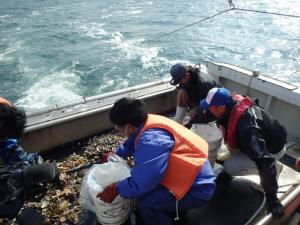 日生町漁協では、地元中学校が環境学習の一環として行うアマモ場再生活動やカキ養殖体験に協力。