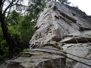 槙谷川の上流にあり中天にそびえ立つ330mの天柱山・剣峰など数知れない奇岩絶壁のいかつい岩石美が見られる景勝地です。