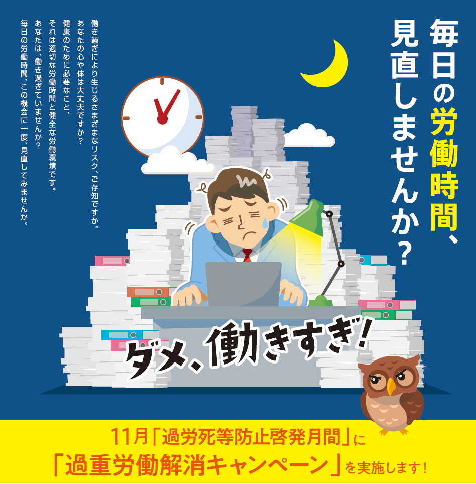 この月間は「過労死等防止対策推進法」に基づくもので、過労死等を防止することの重要性について国民の自覚を促し、関心と理解を高めるため、毎年11月に実施しています。