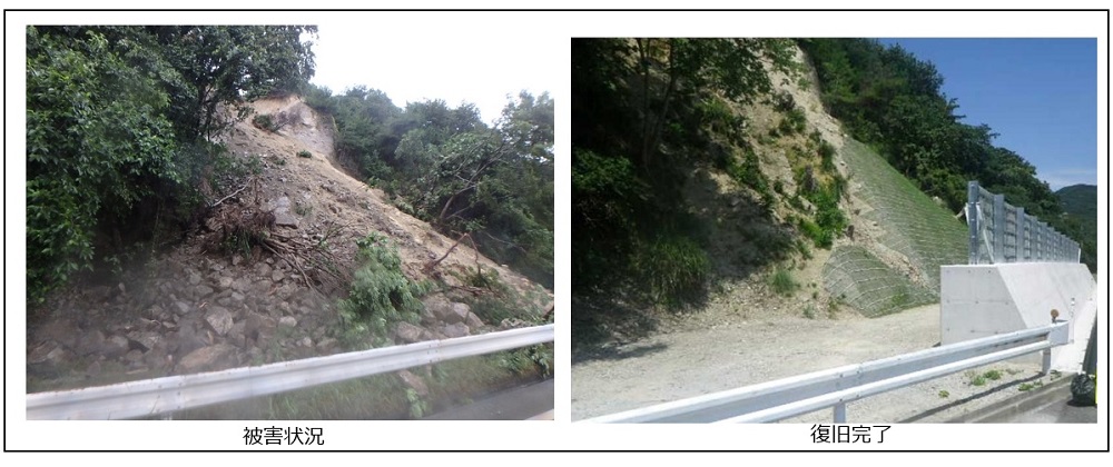緊急に崩壊土砂の撤去及び仮設防護柵を設置して片側交互通行とし、斜面の安定を図る法面工事を進め、令和元年11月に復旧工事が完了しました。