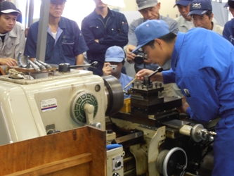 旋盤でネジ切りのデモンストレーションを行う指導員。