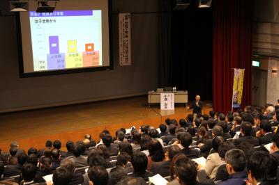 大会では、東海大学の小澤教授に、朝食摂取の重要性や運動の学習への効果等について、講演をしていただきました(演題「早寝・早起き・朝ご飯、テレビを止めて外遊び」~学力・体力・気力の向上は、生活習慣の立て直しから~)。参加した300名以上のj教職員らは、小澤先生自身の指導者としての経験や科学的根拠に基づいた話から、生活習慣確立の重要性について認識を深めました。
