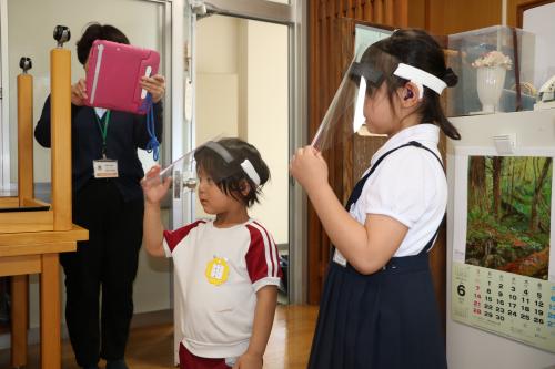 寄贈式では、三菱自動車水島製作所の近藤俊雄副所長から生徒会長の高等部3年西城辰哉さんへ、同校の卒業生でもあるビジネスパートナー人事部満永要さんから小学部1年小西妃愛莉(ひなり)さんと幼稚部2年彪真(ひゅうま)さんの姉弟へ、それぞれフェイスシールドが手渡されました。幼児児童生徒を代表して西城さんが、「フェイスシールドのおかげで、安心して勉強に取り組めます。大切に使わせていただきます」とお礼の言葉を述べました。寄贈式終了後には、小西妃愛莉さんと彪真さんが早速フェイスシールドを試着していました。