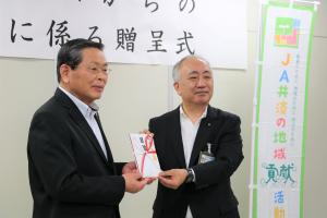 JA共済連岡山の青江伯夫会長から目録が贈呈されると、鍵本芳明県教育長が「未来を担う農業者育成に邁進してまいりたい」とお礼を述べました。