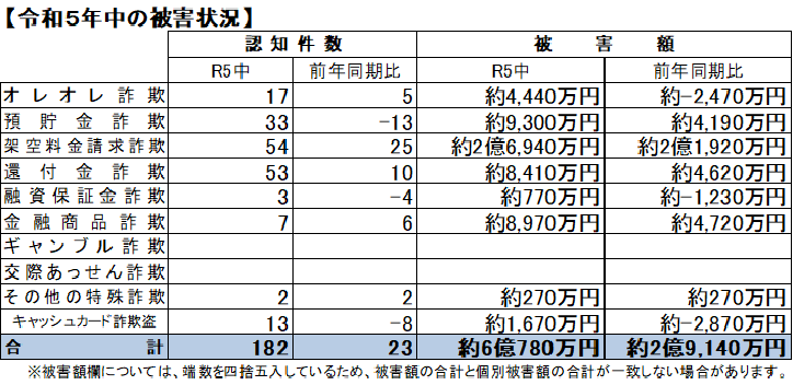 岡山県内の過去の特殊詐欺発生状況(令和5年中) [その他のファイル/54KB]