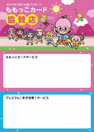 「おかやま子育て応援パスポート(ももっこカード)」は、協賛店で提示すると、いろいろな子育て応援サービスを受けることができるカードです。協賛店のご厚意により割引や特典などの独自のサービスを提供していただくことで、地域全体で子育てを温かく応援する仕組みです。