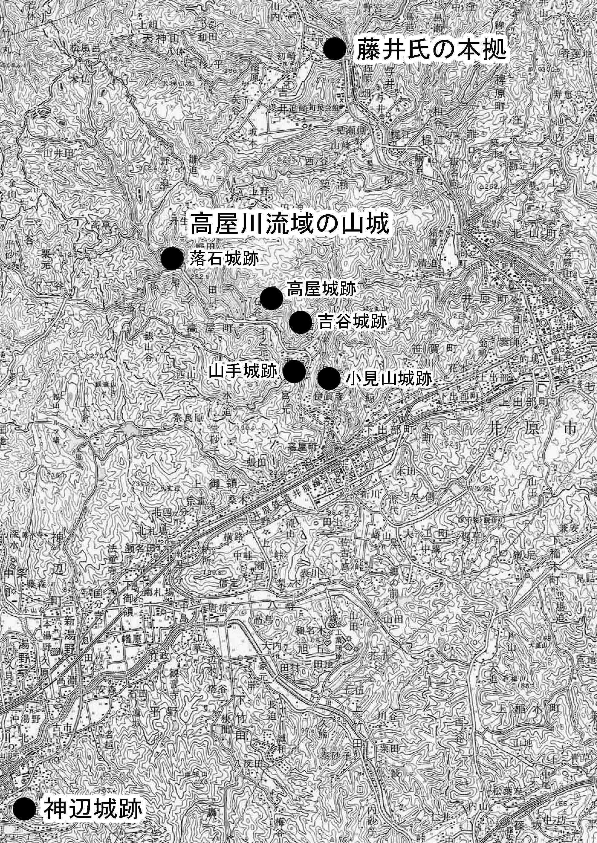 ここで紹介する高屋川流域に残された城は、この騒動に関連したものと考えられています。わずか3kmほどの間に、落石〈おちいし〉城・高屋城・吉谷〈よしだに〉城・山手〈やまて〉城・小見山〈こみやま〉城という5城が築かれており、井原市域で最も山城が密集する地点です。この地域は、藤井氏の本拠である井原市芳井町と神辺城の中間地点にあたります(図1)。またこの時の状況を記した小早川隆景〈こばやかわたかかげ〉の書状(1)に、「藤井氏が山野〈やまの〉(福山市)と吉井〈よしい〉(井原市芳井町)の間に城を築いた」と書かれています。まさにここに残された山城群のことを言っているのだと思われます。これらの山城を、北に位置するものから見ていきましょう。
