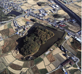 空から見た両宮山古墳。古墳の周りにあるのが濠です。(赤磐市教育委員会提供)
