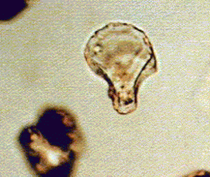 プラント・オパールとは植物の葉の細胞に形成された50ミクロンほどの小さな珪酸体(ガラス質)のことで、特にイネ科植物では植物の種類ごとに異なる形状を示しているため、たとえばイネのものを識別することが可能になっている。