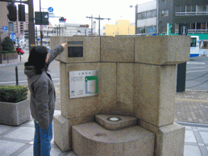 洪水時の水位を示す銘板。(岡山市丸の内 中国銀行本店前に設置)。海抜6.13m、現在の地表面から約1.65mの高さにある。